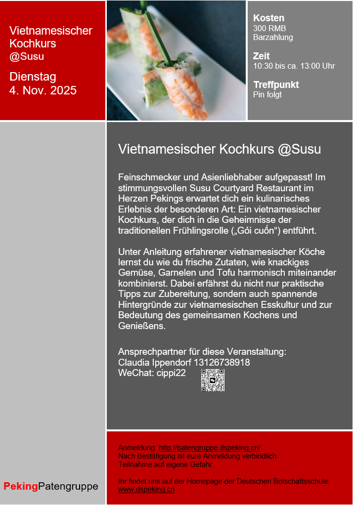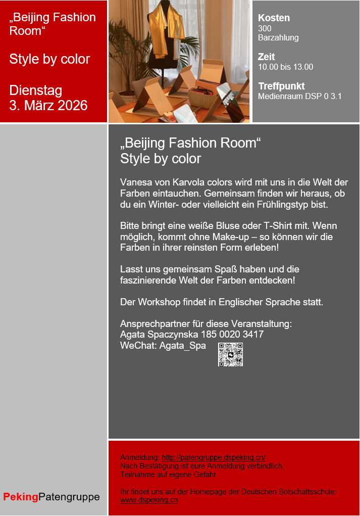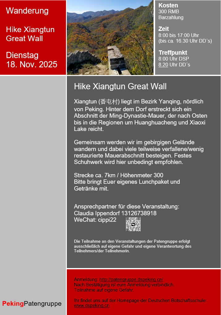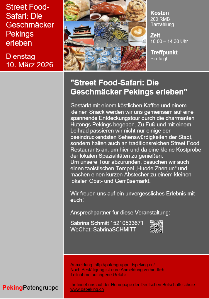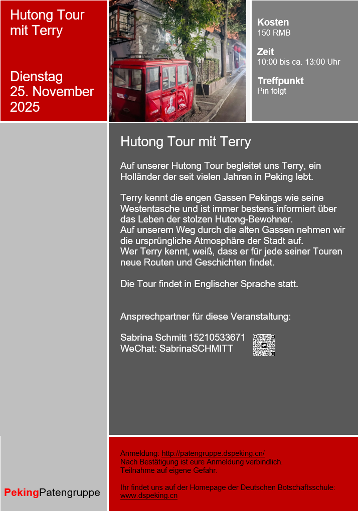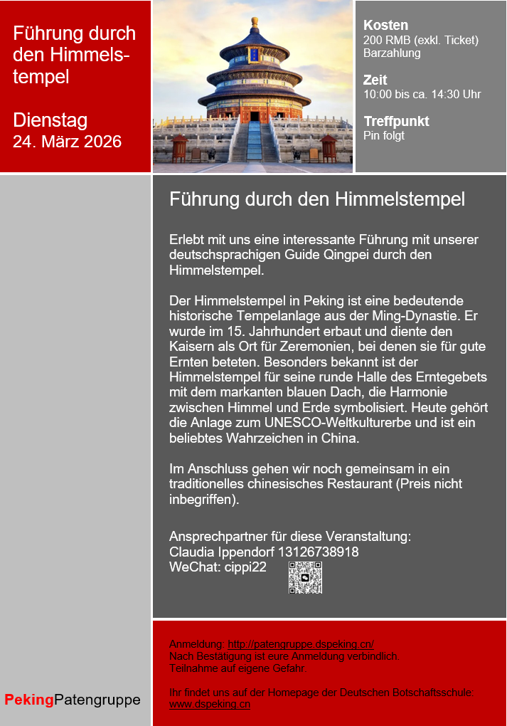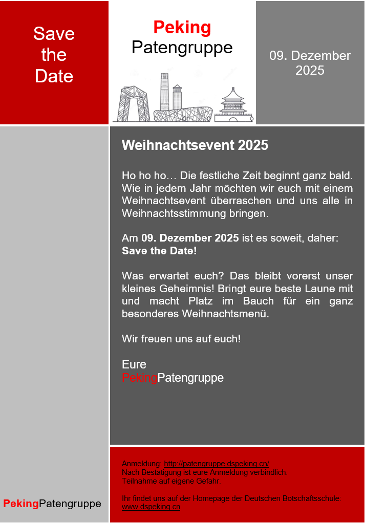 Alle Veranstaltungstermine findet ihr unter "Veranstaltungen der Patengruppe" und auf der Homepage der Deutschen Botschaftsschule Peking. Dort erhaltet ihr auch weitere Informationen und viele nützliche Tipps rund um das Leben in Peking.