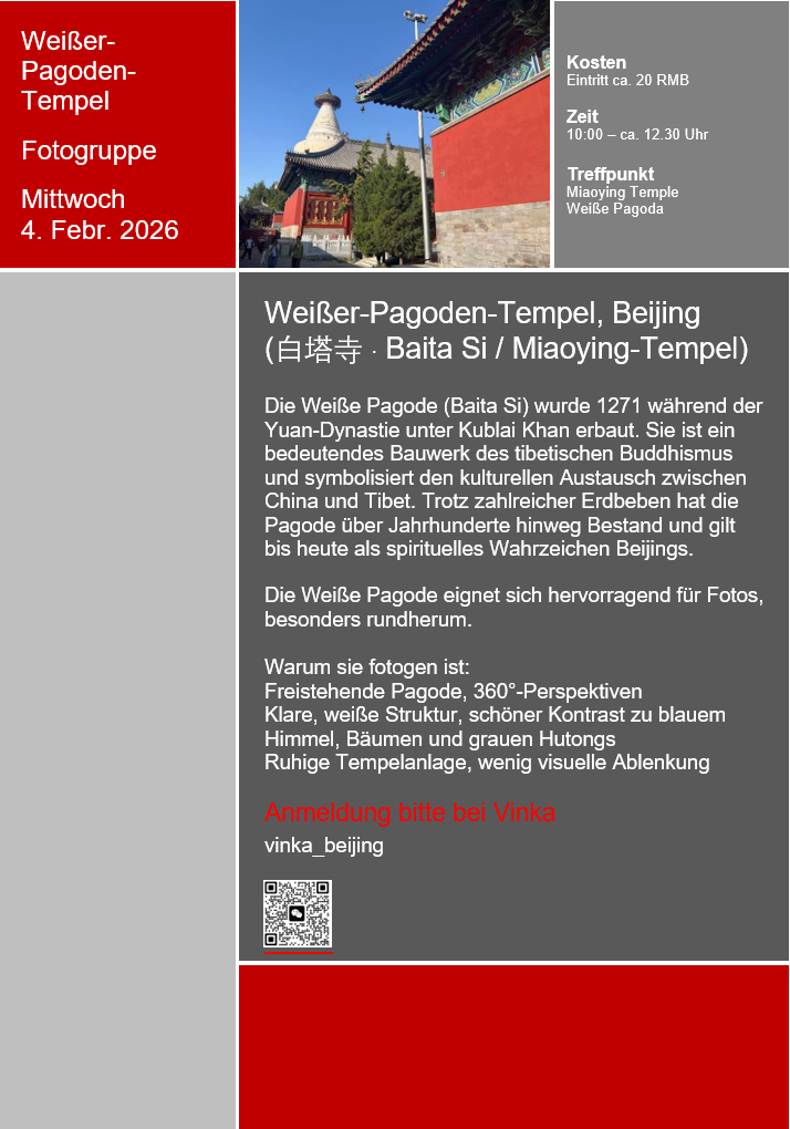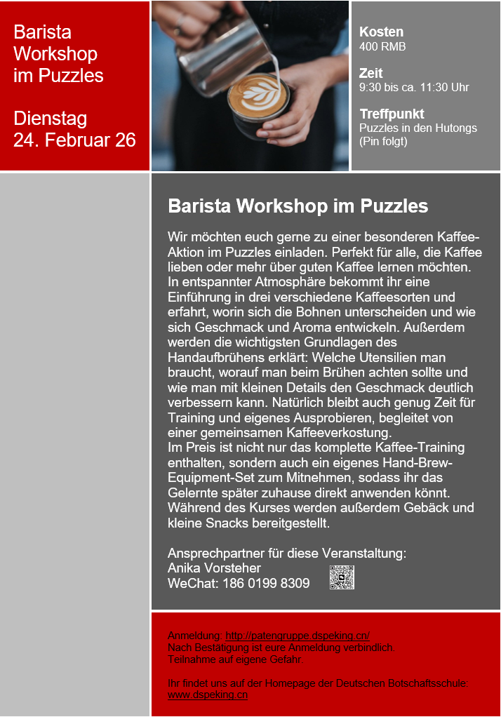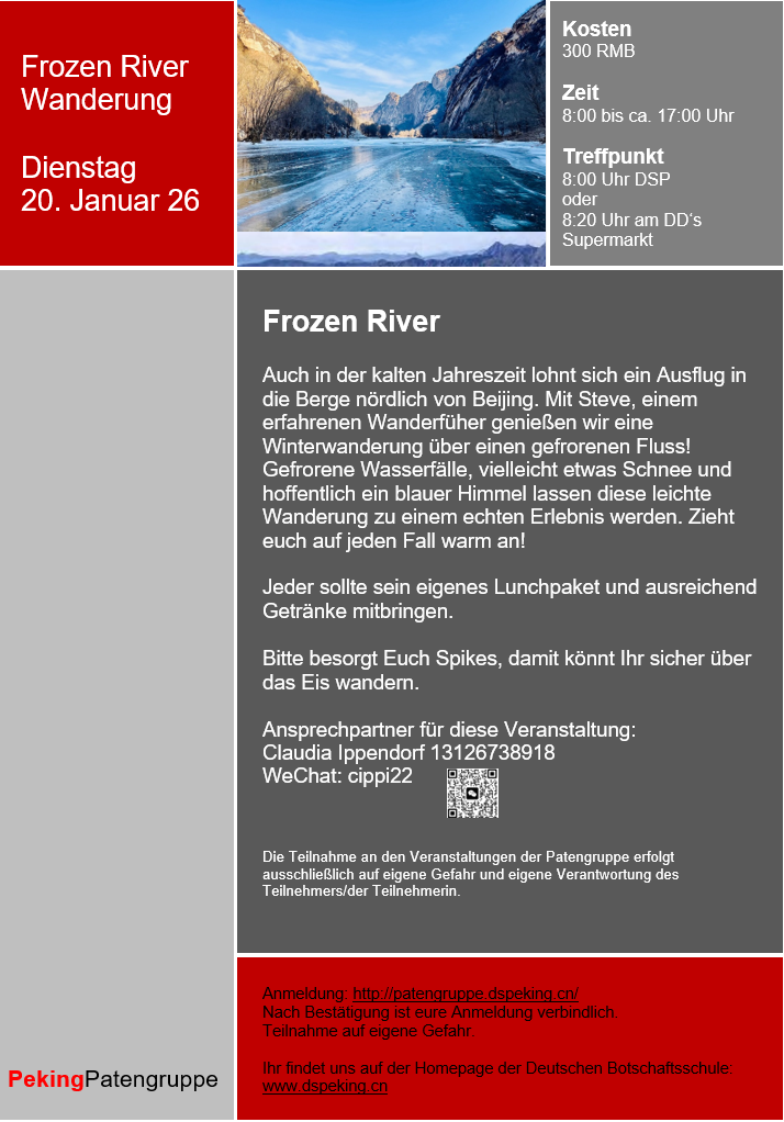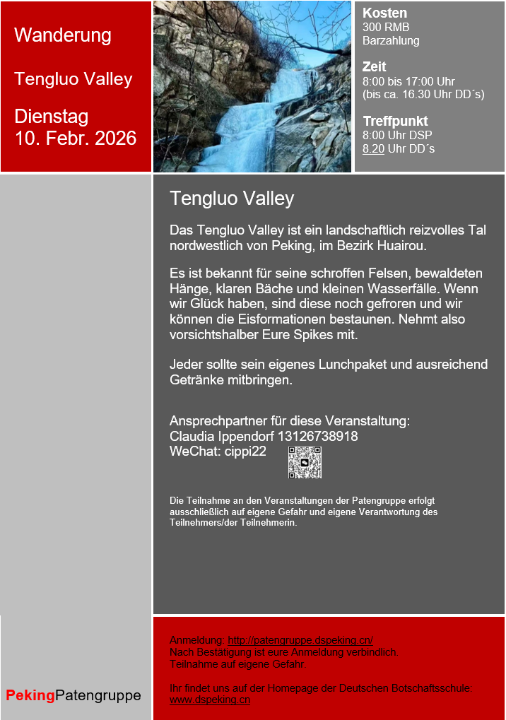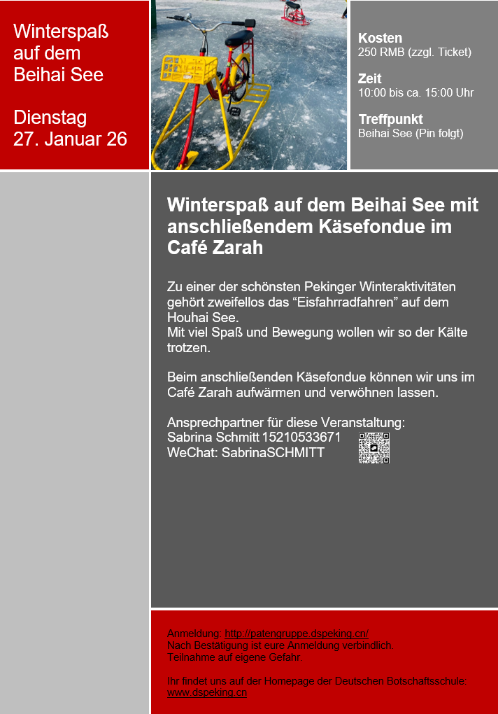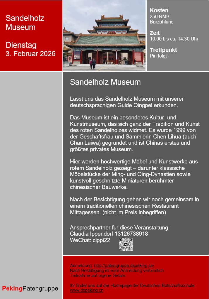 Alle Veranstaltungstermine findet ihr unter "Veranstaltungen der Patengruppe" und auf der Homepage der Deutschen Botschaftsschule Peking. Dort erhaltet ihr auch weitere Informationen und viele nützliche Tipps rund um das Leben in Peking.